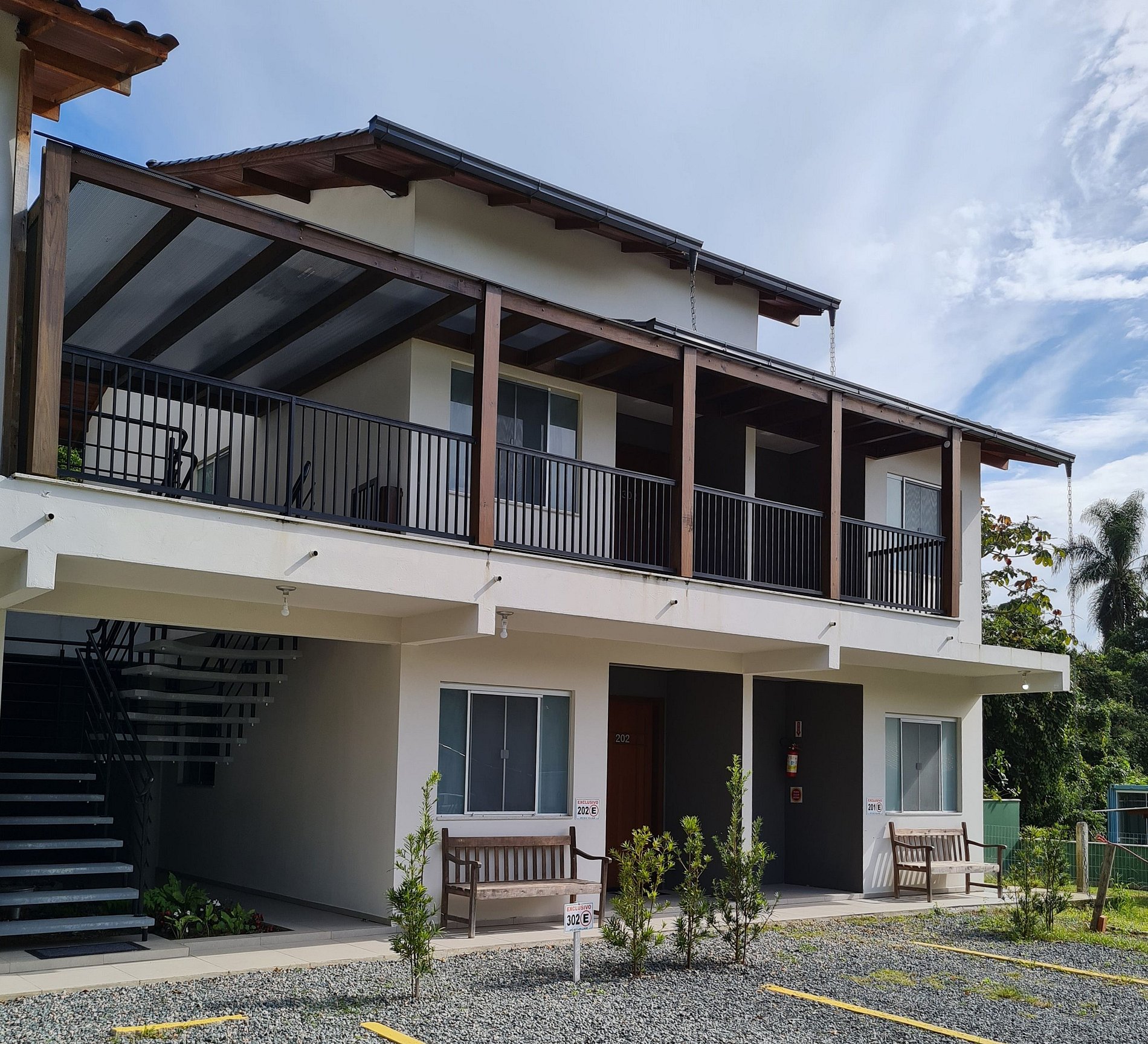 O edifício é composto por 2 blocos de 4 apartamentos cada, situado em um condomínio com outras casas e uma pousada.