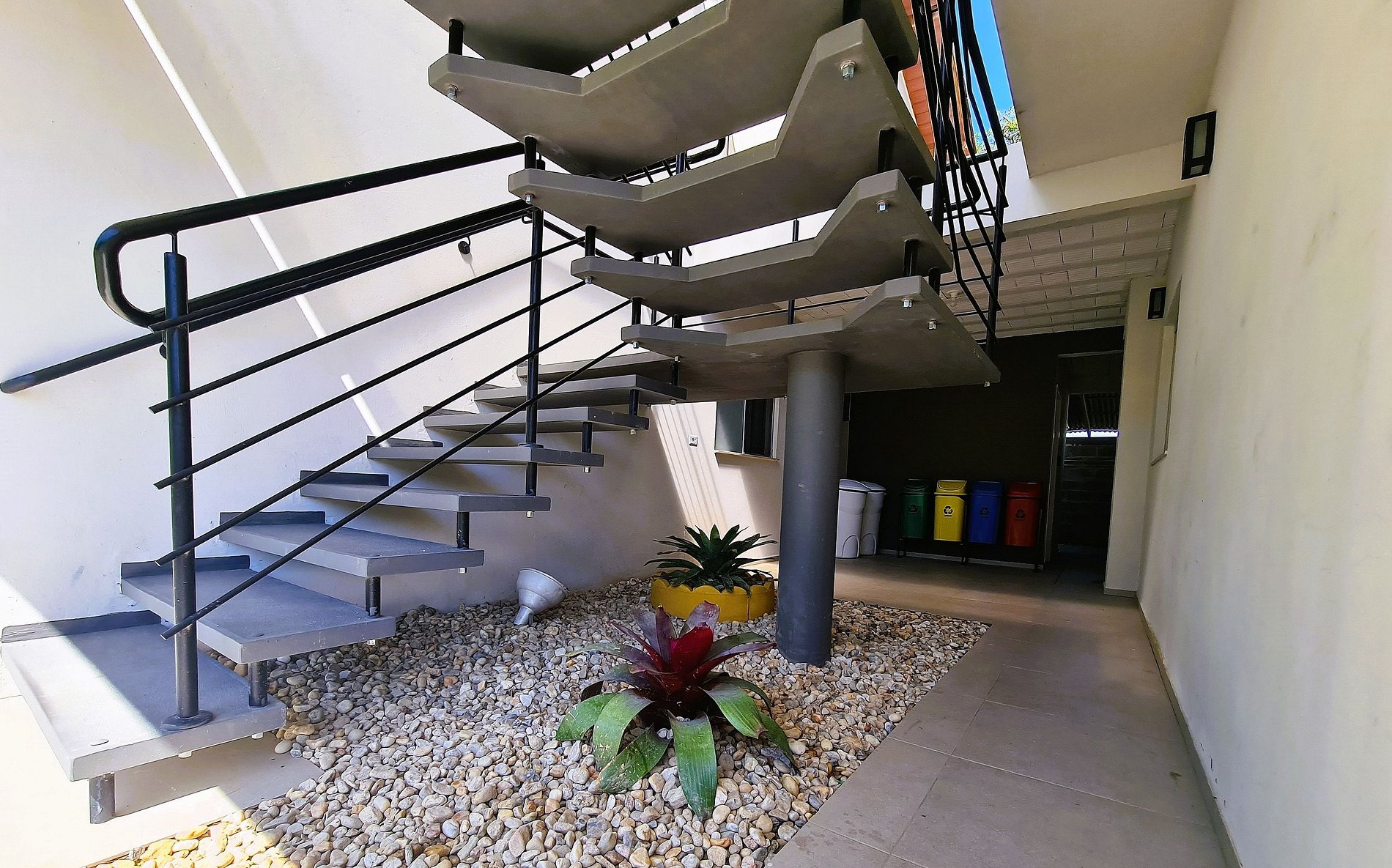 O edifício é composto por 2 blocos de 4 apartamentos cada, situado em um condomínio com outras casas e uma pousada.